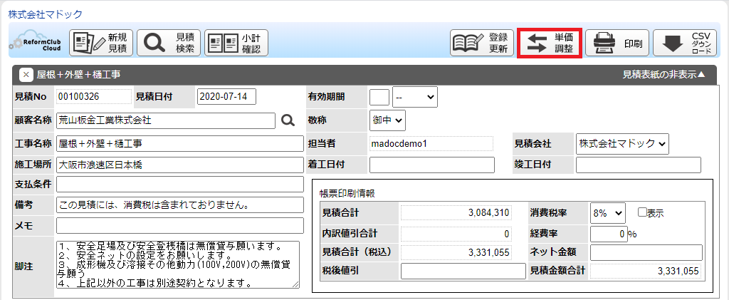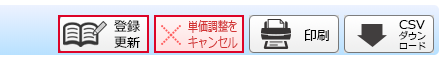 4.金額などに問題がなければ右上の見積登録をクリックします。操作をやり直す際は単価調整をキャンセルするをクリックすると変更が破棄されます。
