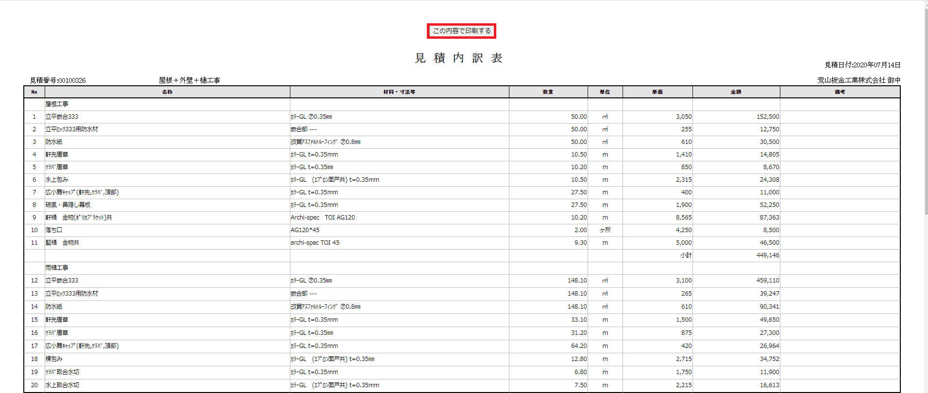 印刷する際は表示されたウィンドウを確認し、ページ上部にある「この内容で印刷する」をクリックし印刷を実行します。