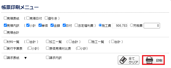メニューより、それぞれチェックボックスをクリックすると印刷する項目を設定できます。