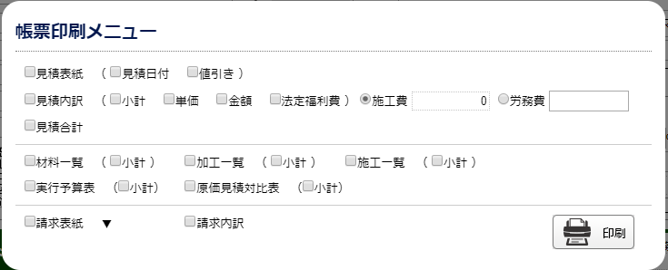 メニューより、請求表紙、請求内訳等のチェックボックスを選択します。