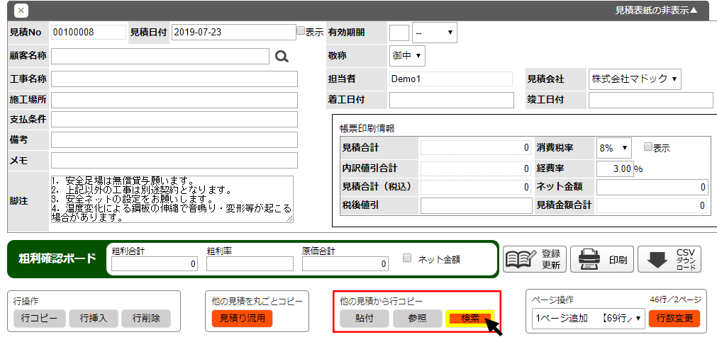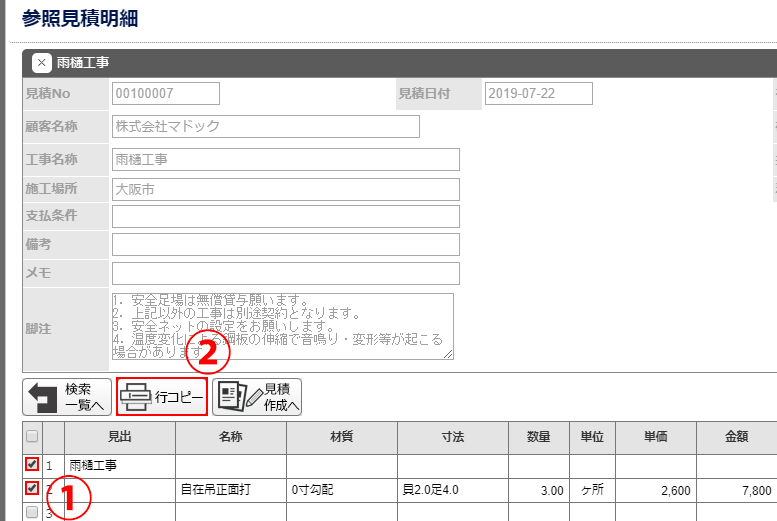 2.他の見積もりから行コピーの中の検索ボタンをクリックし検索画面に移行します。