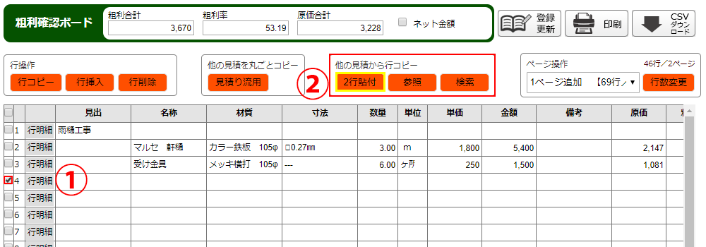 見積流用機能は見積もりデータ丸ごとコピーする機能でしたが、部分的な流用を行うことも可能です。参照検索より過去のデータを選び、その見積もりデータの数行のみを流用する、という事も出来ます。