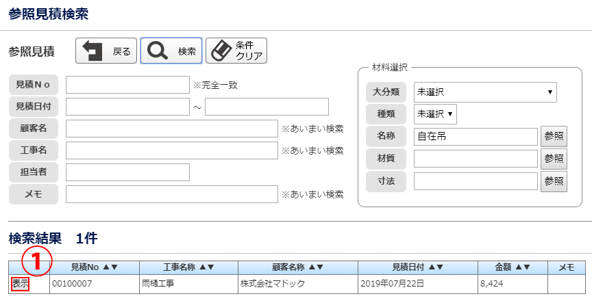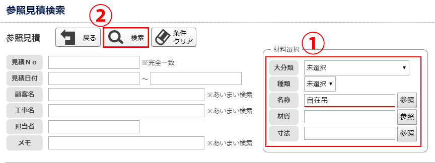 3.過去の物件から使用する材料名などを入力し、検索します。