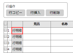 行明細のコピー等の編集を行う際は、操作したい行明細横のチェックボタンをクリックし行操作のボタンから各種編集を行うことが出来ます。
