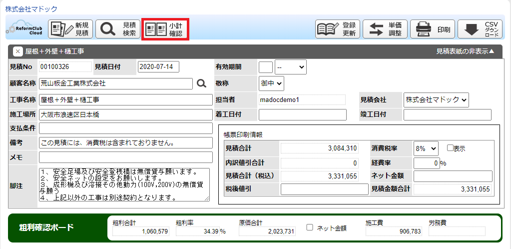 見出毎の小計(見積金額、原価金額(材料、加工、施工、経費))を確認することができます。