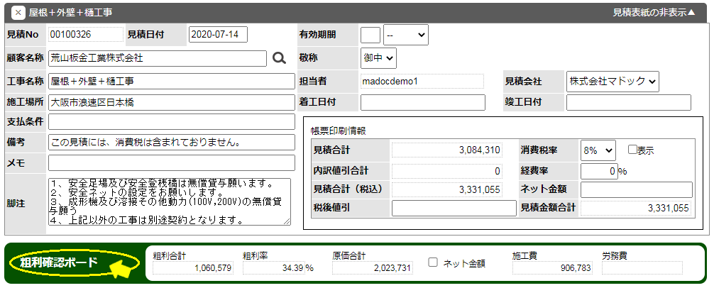 見積を閉じずに、粗利及び原価金額を非表示に出来る便利な機能です。