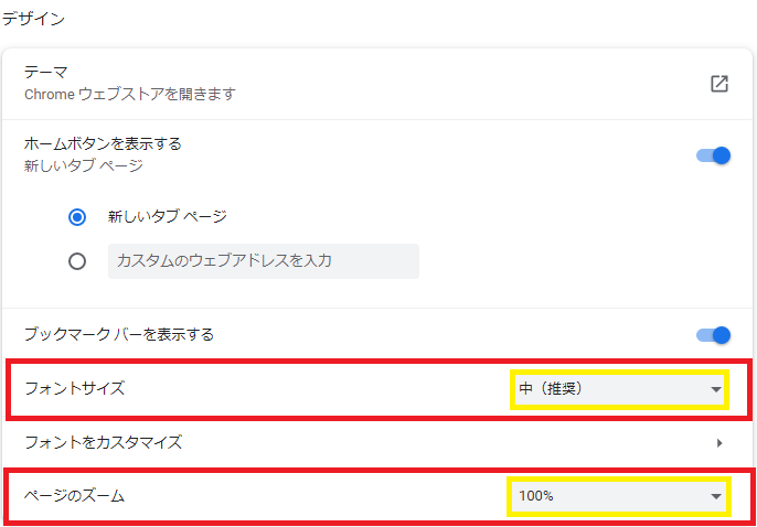 Chromeブラウザの設定をご確認ください。(設定) フォントサイズは【中(推奨)】、ページのズームは【100%】、の設定を行ってください。