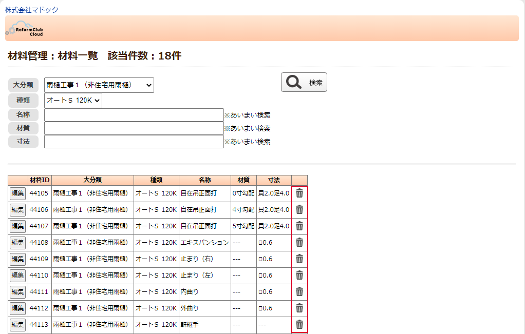 大分類、種類を選択を行い検索を行うか、名称・材質・寸法をあいまい検索により検索することも可能です。 登録した材料リストが表示されます。左のゴミ箱ボタンをクリックすると項目の削除が行なえます。