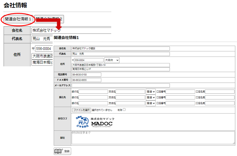 1.まず、自社マスタ画面より「関連会社情報1」ボタンを押下し、関連会社情報を登録します。