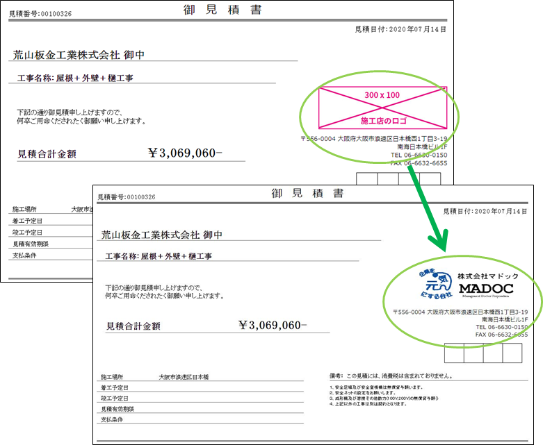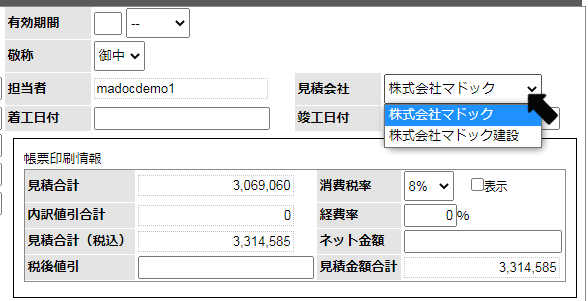 見積や請求書表紙の会社情報部分を自社情報ではなく、グループ会社の情報を表示&印刷することができます。
