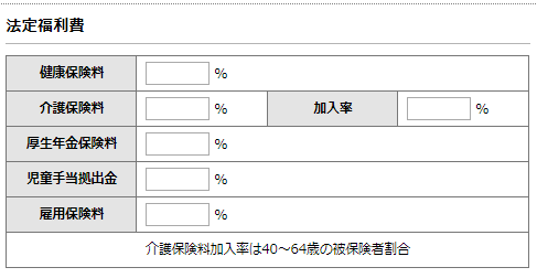 自社情報のオプションより下記の事業主負担税率を入力します。これらが福利法定費の計算の際の元となります。